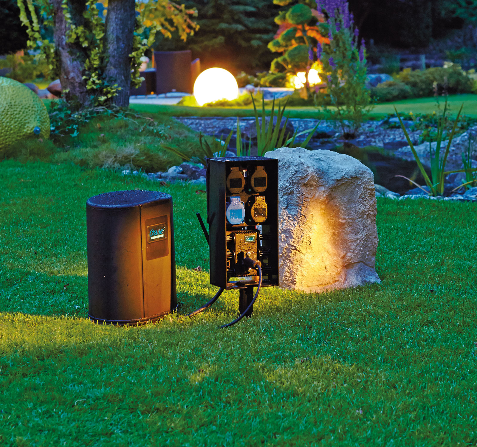 Mit den Gartensteckdosen der Serie InScenio organisieren Sie die gesamte Garten- und Teichtechnik. Das Baukastensystem bietet Anschlussmöglichkeiten für alle Ansprüche. Über die Funkbedienung mit 80 m Reichweite lassen sich die unterschiedlichsten Geräte z.B. Bachlaufpumpen ein- und ausschalten, dimmen oder in der Leistung regulieren. Das ist professionelles Strommanagement! InScenio ist auch für den Anfänger einfach zu installieren und nachträglich jederzeit und ganz ohne Erdarbeiten zu erweitern.